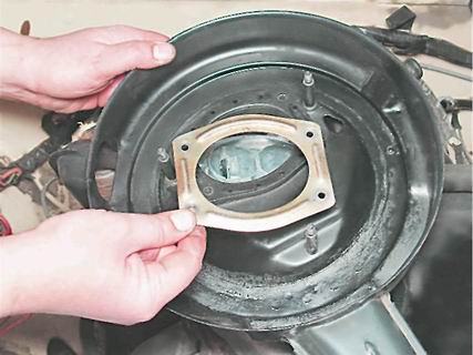 10. Снимаем со шпилек карбюратора корпус фильтра, пластину крепления и резиновую прокладку, следя за тем, чтобы из отверстий резиновой прокладки не выпали дистанционные втулки.
