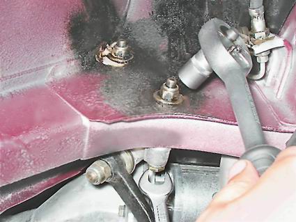 3. Торцовым ключом на 19 мм отворачиваем две гайки крепления кронштейна рычага к правому лонжерону кузова, удерживая болты от проворачивания ключом того же размера.