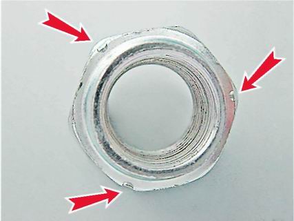 Детали передней подвески: 1 - поворотный кулак (2101-3001014/15); 2 - верхняя шаровая опора (2101-2904192-01); 3 - буфер хода сжатия (2101-2904230); 4 - верхний рычаг (2101-2904100/01); 5 - стабилизатор поперечной устойчивости (2101-2906010); 6 - поперечина передней подвески (2101-2904200); 7 - нижний рычаг (2101-2904020-01/21-01); 8 - амортизатор (2101-2905402-05); 9 - пружина (2101-2902712); 10 - нижняя шаровая опора (2101-2904082); 11 - ступица с подшипниками (2101-3103002); 12 - колпак ступицы (2101-3101065)Передняя подвеска - независимая на двойных поперечных рычагах. Переднее колесо соединено четырьмя болтами со ступицей, установленной на двух роликовых конических подшипниках. Подшипники установлены в ступице и зафиксированы гайкой. Гайка крепления ступицы правого колеса имеет левую резьбу и маркировку в виде трех точек.