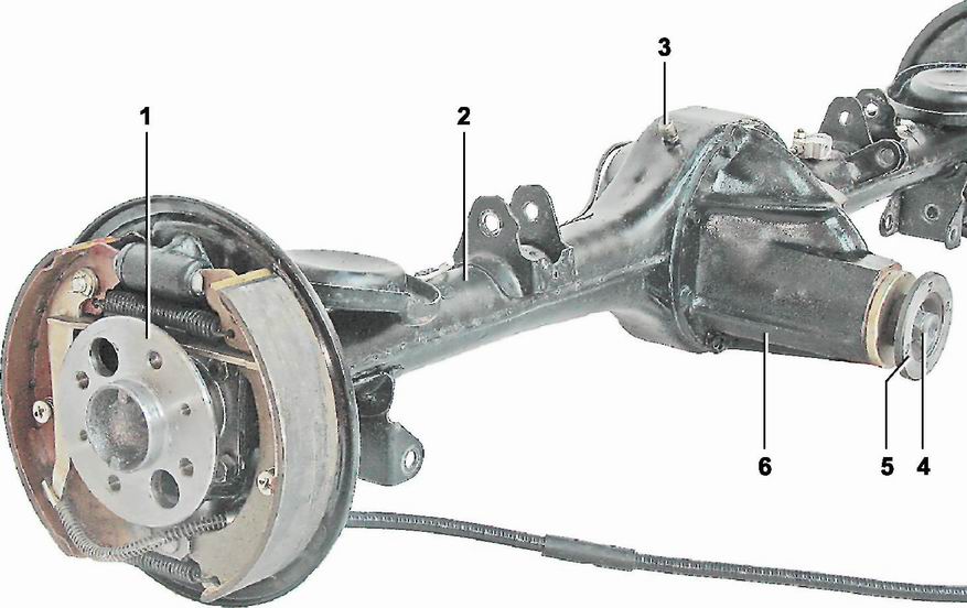 Задний мост: 1 - полуось (2103-2403069); 2 - балка заднего моста (21012401010-01); 3 - сапун (2101-2401050-01); 4 - гайка хвостовика ведущей шестерни главной передачи М16х1,5 (12574921); 5 - фланец ведущей шестерни с грязеотражателем (2101-2201100-10); 6 - картер редуктора (2101-2402015-10)Главная передача - гипоидная, ось ведущей шестерни смещена вниз, передаточное число 4,44; 4,3 или 4,1 (в зависимости от модификации автомобиля). Маркировка передаточного числа нанесена на ведомой шестерне. Дифференциал - шестеренчатый, конический, двухсателлитный. Корпус дифференциала вместе с прикрепленной к нему болтами ведомой шестерней главной передачи установлен в картере на двух роликовых конических подшипниках. Регулировка подшипников и осевого положения шестерни осуществляется двумя регулировочными кольцевыми гайками с внешней резьбой, завернутыми в разъемные постели подшипников. Ведущая шестерня, изготовленная заодно с хвостовиком, установлена в картере также на двух конических роликовых подшипниках. Ее осевое положение определяется толщиной регулировочного кольца, размещенного между шестерней и внутренним подшипником. На шлицевом конце хвостовика установлен фланец, соединенный болтами с фланцевой вилкой заднего карданного шарнира. Фланец крепится к хвостовику гайкой, которой одновременно осуществляется регулировка подшипников хвостовика. Между внутренними кольцами подшипников установлена распорная втулка, которая деформируется при затягивании гайки, обеспечивая предварительный натяг в подшипниках. Полуоси своими шлицевыми концами входят в отверстия полуосевых шестерен дифференциала. Наружные концы полуосей опираются на шариковые подшипники, установленные в расточках фланцев балки заднего моста. Полуоси зафиксированы от осевого смещения относительно подшипников напрессованными запорными кольцами. На концах полуосей имеются фланцы, к которым болтами крепятся задние колеса автомобиля. Редуктор заднего моста смазывается трансмиссионным маслом, залитым в балку моста в объеме 1,3 л. Для замены масла в балке выполнены заливное и сливное отверстия, закрываемые пробками с самоуплотняющейся конической резьбой. Подшипники полуосей снабжены обрезиненными уплотнительными шайбами и заполнены пластичной смазкой на весь срок службы. Вытеканию масла из заднего моста препятствуют сальники, установленные на концах полуосей и хвостовике ведущей шестерни. Чтобы при рабочем нагреве редуктора давление воздуха внутри моста не повышалось, что может привести к утечке масла через сальники, на балке установлен сапун (предохранительный клапан). |