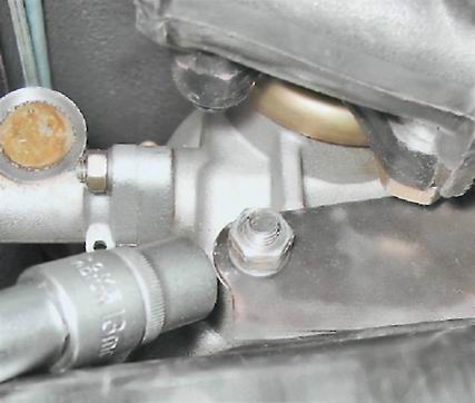 3. Торцовым ключом на 17 мм с карданом отворачиваем гайку верхнего крепления опоры с левой стороны силового агрегата.