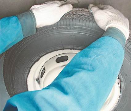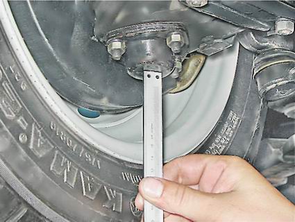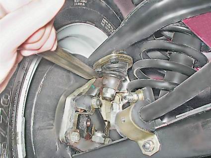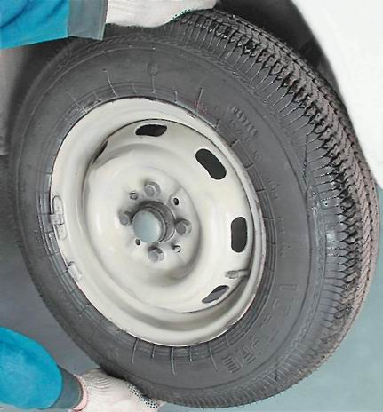 7. Проверяем наличие осевого люфта в подшипниках ступицы переднего колеса. Вывесив колесо и взявшись за него в вертикальной плоскости, поочередно резкими движениями верхней части колеса на себя, а нижней от себя определяем наличие люфта.