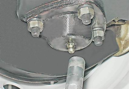 5. Если это расстояние больше 11,8 мм, шаровую опору заменяем. 6. Для смазки шарнира вворачиваем в шаровую опору масленку и нагнетателем подаем смазку ШРБ-4 или аналогичную в полость опоры, следя за тем, чтобы защитный чехол опоры не раздувался.