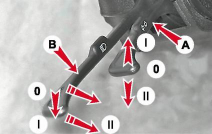 Подрулевые переключателиПодрулевые переключатели установлены на рулевой колонке. С левой стороны рулевой колонки расположены рычаги переключателя указателей поворота А и переключателя света фар В.