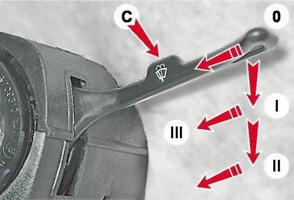 Положения подрулевого переключателя стеклоочистителя С: 0 - стеклоочиститель ветрового стекла выключен; I - стеклоочиститель ветрового стекла работает в прерывистом режиме; II - стеклоочиститель ветрового стекла работает непрерывно; III - включается омыватель ветрового стекла. |