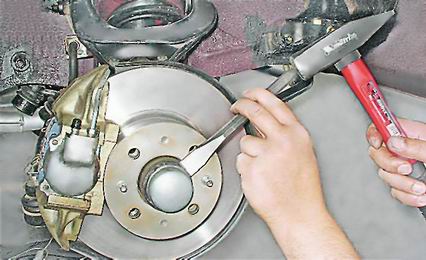 Подшипники ступицы переднего колеса - регулировкаУвеличенные зазоры в подшипниках ступицы переднего колеса приводят к снижению их срока службы, вибрациям при движении и ускоренному износу шин. Чрезмерно затянутые подшипники сильно нагреваются и теряют работоспособность. Последовательность выполнения 1. Подготавливаем автомобиль к выполнению работы (см. "Подготовка автомобиля к ТО и ремонту"). 2. Снимаем колесо (см. "Колесо - замена"). 3. С помощью зубила снимаем защитный колпак ступицы.
