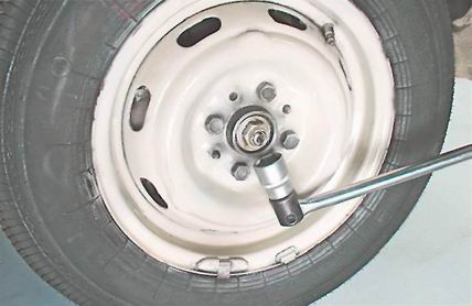 4. Устанавливаем колесо без защитного колпака на место и крепим его двумя диаметрально расположенными болтами. Зубилом или бородком расправляем замятый буртик гайки ступицы и отворачиваем гайку торцовым ключом на 27 мм. 5. Затягиваем новую регулировочную гайку моментом 1,9-2,0 кг·см, при этом вращаем колесо в обоих направлениях для правильной установки роликов подшипников.