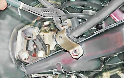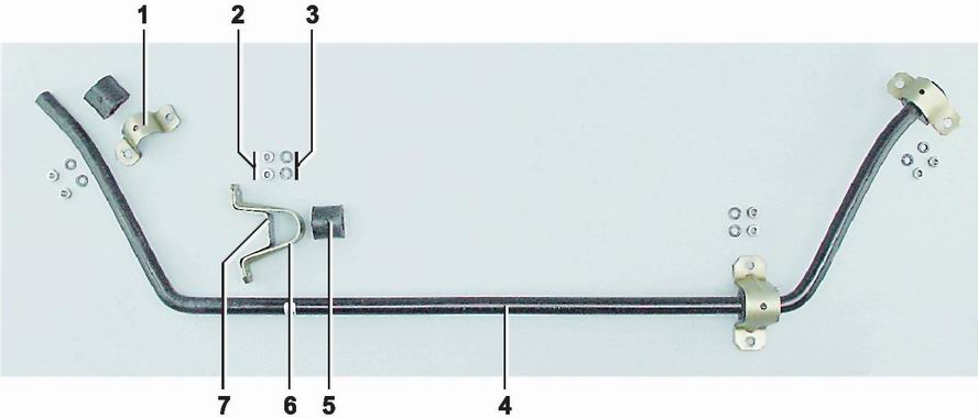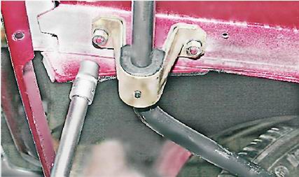 Подушки и штанга стабилизатора поперечной устойчивости - заменаСтабилизатор поперечной устойчивости снимаем при деформации штанги или замене всех резиновых подушек кронштейнов ее крепления. Резиновые подушки обойм крепления штанги стабилизатора к рычагам заменяем, не снимая самой штанги.