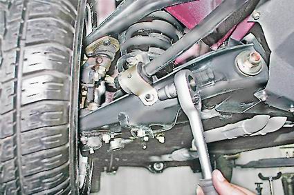 6. Торцовым ключом на 13 мм с удлинителем отворачиваем две гайки крепления кронштейна стабилизатора к лонжерону кузова. 7. Аналогично отворачиваем гайки крепления второго кронштейна и снимаем стабилизатор. Очищаем штангу стабилизатора от грязи. 8. Для замены подушки кронштейна стабилизатора зажимаем кронштейн в тисках. Если штанга стабилизатора не требует замены, то помечаем положение подушек кронштейна относительно штанги стабилизатора для облегчения последующей сборки. Смазываем мыльным раствором штангу стабилизатора для облегчения снятия кронштейна с подушкой. 9. Поворачивая штангу стабилизатора в разные стороны, вытягиваем ее из подушки кронштейна.