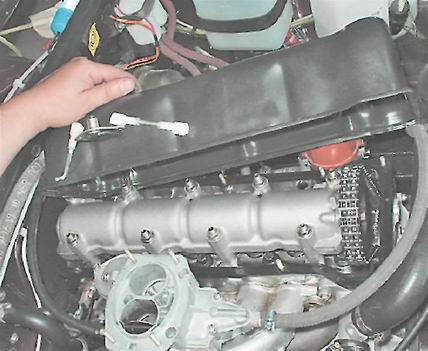 3. Отсоединяем от карбюратора трос привода воздушной заслонки (см. "Крышка карбюратора - снятие и разборка") и наконечник тяги привода дроссельной заслонки (см. "Карбюратор - снятие и установка").