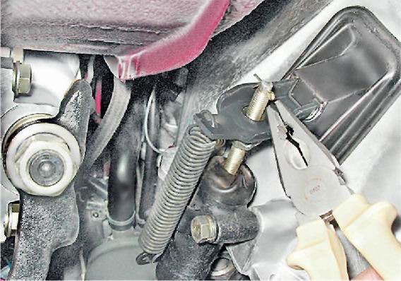 4. Плоскогубцами снимаем оттяжную пружину вилки выключения сцепления.