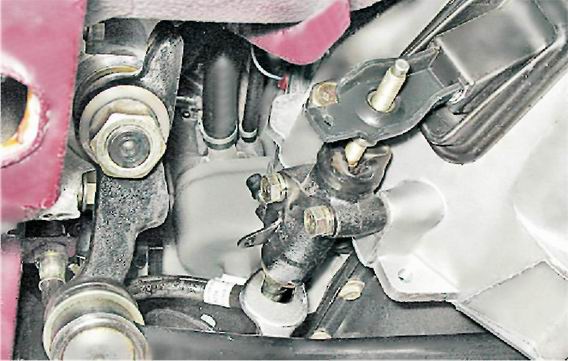 Рабочий цилиндр гидропривода выключения сцепления - снятие и установкаСнятие 1. Устанавливаем автомобиль на смотровую яму или эстакаду (см. "Подготовка автомобиля к ТО и ремонту"). 2. Сливаем жидкость из гидропривода сцепления (см. "Гидропривод выключения сцепления замена жидкости и прокачка"). 3. Плоскогубцами вынимаем шплинт из отверстия толкателя рабочего цилиндра.