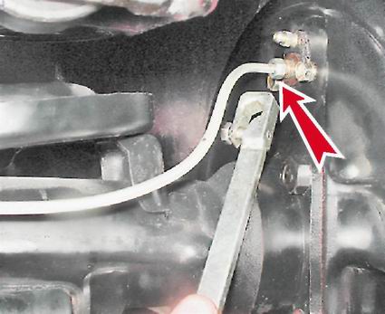 Внимание! Если штуцер "прикипел" к трубке и отвернуть его не удается, попробуйте (после выполнения п. 6) отвернуть цилиндр, удерживая штуцер специальным ключом на 10 мм для тормозных трубок. При таком способе снятия цилиндра тормозную трубку необходимо заменить. 5. Для уменьшения потерь тормозной жидкости надеваем на конец трубки защитный колпачок (от штуцера прокачки тормозного цилиндра). 6. Торцовым ключом на 10 мм отворачиваем два болта крепления рабочего цилиндра и снимаем его.