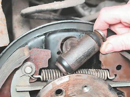 7. Повернув цилиндр относительно отверстия в тормозном щите, выводим упоры цилиндра из зацепления с тормозными колодками.
