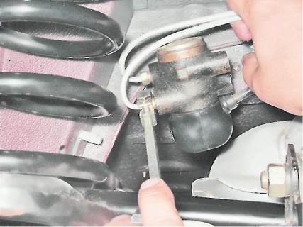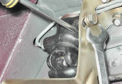 6. Специальным ключом на 10 мм для тормозных трубок отворачиваем два штуцера крепления трубок к регулятору и отводим их в сторону.