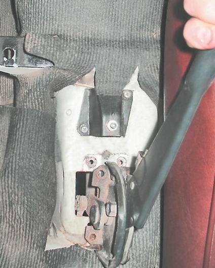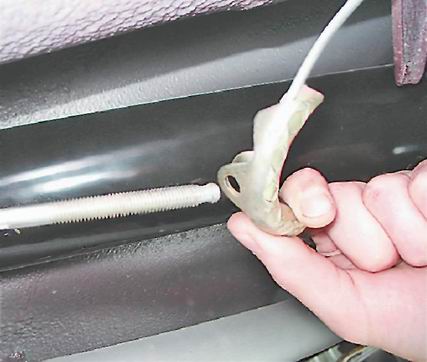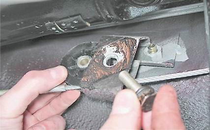 7. Снимаем с рычагов привода наконечники троса (см. "Колодки тормозных механизмов задних колес - замена") не отсоединяя опорных стоек колодок. 8. Поддев отверткой, выводим наконечник оболочки троса из отверстия кронштейна кузова.