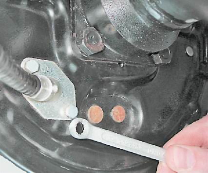 10. Ключом на 8 мм отворачиваем два болта крепления держателя оболочки троса к тормозному щиту.