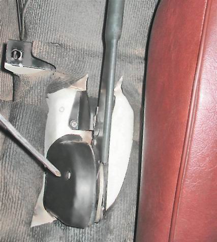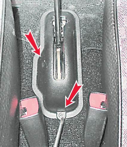 Передний трос снимаем для его замены. Снятие переднего троса На автомобиле может быть установлен рычаг привода стояночной тормозной системы и кожух рычага моделей 2101 или 2103. 1. Снимаем направляющую заднего троса с наконечника переднего и отсоединяем ее от троса (см. выше). 2. Для снятия рычага модели 2101 короткой крестовой отверткой отворачиваем саморез крепления кожуха рычага (сиденье водителя для наглядности снято).