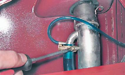 12. Опуская бак, вынимаем вентиляционный шланг из отверстия в лонжероне.