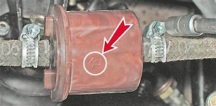 4. Предварительно надев на шланги хомуты, устанавливаем фильтр. Ориентируем фильтр согласно стрелочному указателю на его корпусе в сторону топливного насоса. Затягиваем хомуты.