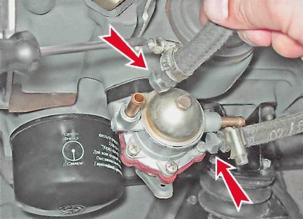 Топливный насос - снятие и установкаСнятие 1. Подготавливаем автомобиль к выполнению работы (см. "Подготовка автомобиля к ТО и ремонту"). 2. Ветошью очищаем от грязи и промываем уайт-спиритом или очистителем двигателя наружную поверхность топливного насоса (если не планируется его замена) и блок цилиндров рядом с местом крепления насоса. Внимание! При выполнении следующей операции из шлангов будет вытекать топливо. Приготовьте два болта М8 для заглушки отверстий шлангов. 3. Ослабляем хомуты крепления топливных шлангов и снимаем шланги со штуцеров топливного насоса. Заглушаем концы шлангов болтами М8.