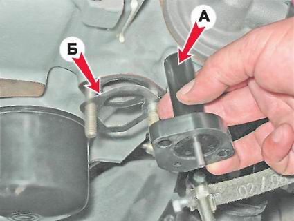 6. Снимаем и очищаем от грязи теплоизолирующую проставку А. При необходимости заменяем прокладку Б между теплоизолирующей проставкой и блоком цилиндров. Толщина прокладки - 0,8 мм.