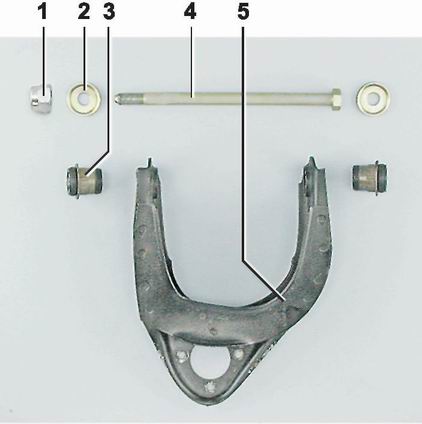 Детали крепления верхнего рычага передней подвески: 1 - гайка самоконтрящаяся М14х1,5 (12574811); 2 - упорная шайба (2101-2904196); 3 - резинометаллический шарнир (2101-2904180); 4 - ось (2101-2904112); 5 - рычаг (2101-2904100/01)Для выполнения работы потребуется приспособление для выпрессовки и запрессовки резинометаллических шарниров. Снятие 1. Подготавливаем автомобиль к выполнению работы (см. "Подготовка автомобиля к ТО и ремонту"). 2. Снимаем колесо (см. "Колесо - замена"). 3. Отсоединяем от верхнего рычага шаровую опору (см. "Шаровые опоры - замена"). 4. Торцовым ключом на 22 мм отворачиваем самоконтрящуюся гайку оси рычага, удерживая ось ключом того же размера.