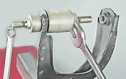 6. Для снятия резинометаллических шарниров закрепляем рычаг в тисках. С помощью специального съемника выпрессовываем из рычага резинометаллические шарниры.