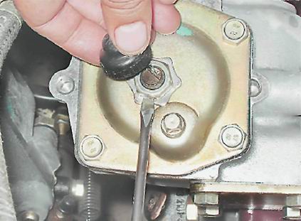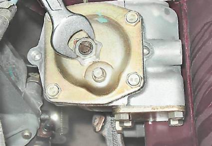 Зацепление в редукторе рулевого механизма - регулировкаДля выполнения работы потребуется помощник. Последовательность выполнения 1. Устанавливаем автомобиль на горизонтальной ровной площадке. Колеса должны быть выставлены в направлении прямолинейного движения (см. "Подготовка автомобиля к ТО и ремонту"). 2. Протираем ветошью крышку картера рулевого механизма. 3. Шлицевой отверткой поддеваем и снимаем защитный колпачок с регулировочного винта.