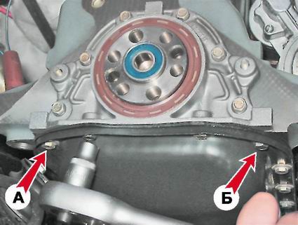 Торцовым ключом на 10 мм отворачиваем два болта крепления поддона картера к держателю и шесть болтов крепления держателя к блоку цилиндров. Болты А и Б ослабляем.