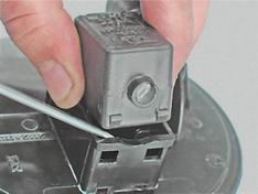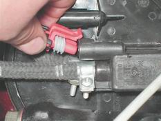 Адсорбер - проверка клапана продувки, снятие и установкаПроверка клапана продувки 1. Подготавливаем автомобиль к выполнению операций (см. "Подготовка автомобиля к TO и ремонту"). 2. Освободив фиксатор, отсоединяем колодку жгута проводов от клапана продувки адсорбера.