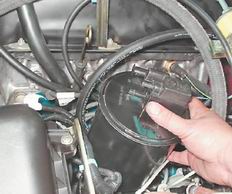 7. Подаем на выводы клапана напряжение 12 B от аккумуляторной батареи ("+" к выводу "А", "-" к выводу "В"). При подаче напряжения на выводы, клапан должен открыться с характерным щелчком. B противном случае клапан неисправен и его необходимо заменить. Снятие адсорбера 1. Отсоединяем от клапана продувки адсорбера колодку жгута проводов и снимаем с патрубка шланг (см. выше). 2. Крестовой отверткой ослабляем затяжку хомута крепления шланга подвода паров топлива к адсорберу и снимаем шланг.