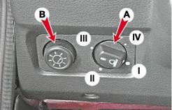 I - один водитель или водитель с пассажиром на переднем сиденье; II - водитель с четырьмя пассажирами; III - водитель с четырьмя пассажирами и грузом в багажном отделении массой не более 75 кг; IV - один водитель и груз в багажном отделении массой не более 100 кг. Регулятор освещения приборов B служит для изменения яркости подсветки приборов. При включенном наружном освещении, при вращении регулятора по часовой стрелке - увеличивается яркость подсветки, в обратную сторону - уменьшается. |