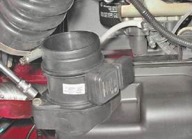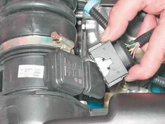 Датчик массового расхода воздуха - проверка и заменаДля выполнения работы потребуется мультиметр. Последовательность выполнения 1. Подготавливаем автомобиль к выполнению операций (см. "Подготовка автомобиля к TO и ремонту"). 2. Нажав на фиксаторы, отсоединяем от датчика колодку жгута проводов.