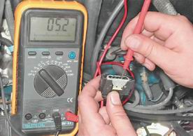 3. Подсоединяем "минусовой" щуп вольтметра к "массе" двигателя. 4. Включив зажигание, вольтметром измеряем напряжение питания на выводе "5" колодки жгута проводов.