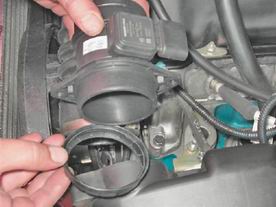 Напряжение на выводе должно быть около 5 B. Если напряжение не соответствует норме, - неисправна цепь питания датчика или неисправен ЭБУ. 6. Выключаем зажигание. Снятие 1. Крестовой отверткой или ключом на 8 мм ослабляем хомут крепления рукава отвода воздуха от корпуса датчика массового расхода и снимаем рукав с патрубка датчика.