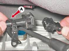 3. Предварительно ослабив пластмассовый хомут A, стягивающий жгуты проводов, нажимаем на пружинные фиксаторы и отсоединяем колодку жгута проводов от колодки датчика скорости автомобиля.