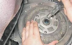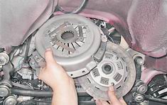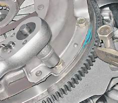 Детали сцепления - снятие и установкаДля работы потребуется центрирующая оправка. Снятие 1. Устанавливаем автомобиль на смотровую яму или эстакаду (см. "Подготовка автомобиля к TO и ремонту"). 2. Снимаем коробку передач (см. "Коробка передач - снятие и установка"). 3. Вворачиваем в отверстие блока цилиндров один из болтов крепления картера сцепления. Совет Если замена корзины не планируется, то кернером помечаем ее положение на маховике. Внимание! При выполнении следующей операции, во избежание деформации кожуха сцепления, болты отворачиваем последовательно, не более чем на один оборот за проход. 4. Удерживая маховик от проворачивания монтажной лопаткой, вставленной между зубьев венца маховика, торцовым ключом на 13 мм отворачиваем шесть болтов крепления корзины к маховику.