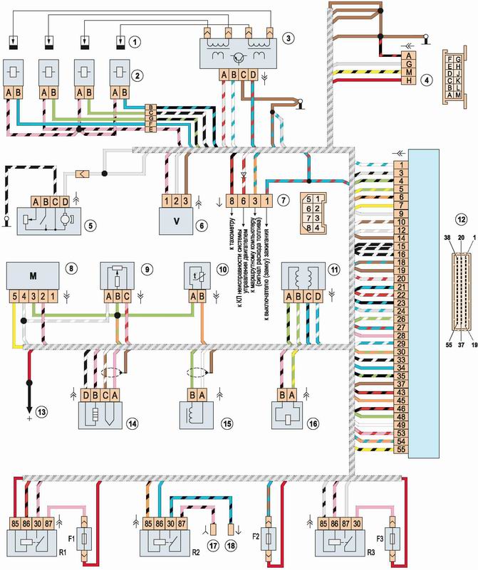 Электрическая схема системы управления двигателем с контроллером Январь-5.1.3: 1 - свечи зажигания; 2 - форсунки; 3 - модуль зажигания; 4 - колодка диагностического разъема; 5 - электробензонасос с датчиком уровня топлива; 6 - датчик скорости автомобиля; 7 - колодка соединения со жгутом проводов панели приборов; 8 - датчик массового расхода воздуха; 9 - датчик управления дроссельной заслонкой; 10 - датчик температуры охлаждающей жидкости; 11 - регулятор холостого хода; 12 - электронный блок управления (ЭБУ^); 13 - к положительному выводу аккумуляторной батареи; 14 - датчик концентрации кислорода; 15 - датчик положения коленчатого вала; 16 - электромагнитный клапан продувки адсорбера; 17 - колодка провода к монтажному блоку (вывод 6 колодки Ш6); 18 - колодка провода к выводу "+" электровентилятора; Rl - главное реле; R2 - реле электровентилятора; R3 - реле электробензонасоса; Fl - предохранитель цепи главного реле (15A); F2 - предохранитель ЭБУ (15A); F3 - предохранитель цепи электробензонасоса (15A) |