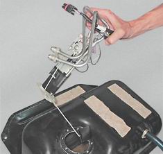 5. Приподнимаем электробензонасос и наклоняя его, выводим из отверстия поплавок датчика указателя уровня топлива.
