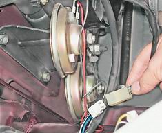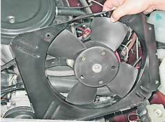 Электровентилятор радиатора - снятие и установкаЭлектровентилятор радиатора состоит из электродвигателя, крыльчатки и кожуха. Работа показана на автомобиле с карбюраторным двигателем. Ha автомобиле с впрысковым двигателем операции 2 и 5 - не выполняются. Снятие 1. Разъединяем колодки проводов электродвигателя крыльчатки.