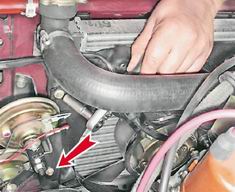 4. Приподнимаем электровентилятор, одновременно вытягивая оболочку проводов датчика из двух фиксаторов, расположенных на кожухе. Ha впрысковом двигателе отворачиваем болт крепления рукавов подвода воздуха к кронштейну крышки головки блока цилиндров (см. "Прокладка крышки головки блока цилиндров - замена") и, отодвинув рукава, приподнимаем электровентилятор. 5. Сжав пассатижами лепестки фиксаторов оболочки проводов датчика, выталкиваем фиксаторы из кожуха.