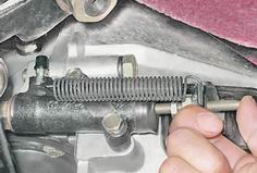 3. Ha автомобиле с системой впрыска снимаем дополнительный грязезащитный щиток (см. "Грязезащитный щиток - снятие и установка"). 4. Очищаем толкатель от грязи и наносим на его резьбу проникающую смазку. 5. Проверяем свободный ход толкателя рабочего цилиндра, от которого зависит свободный ход выжимного подшипника. Для этого, рукой отжимаем вилку сцепления назад до упора, при этом свободный ход толкателя должен быть в пределах 4-5 мм. Если усилие пружины слишком большое, то для удобства ее можно отсоединить от рычага.