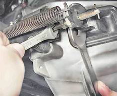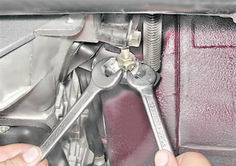 7. Удерживая толкатель за лыски от проворачивания ключом на 8 мм, вращаем ключом на 17 мм регулировочную гайку и устанавливаем необходимый свободный ход толкателя (4-5 мм).