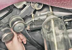 Гидропривод выключения сцепления - замена жидкости и прокачкаДля выполнения работы потребуется помощник, а также емкость и шланг для слива жидкости. Последовательность выполнения 1. Устанавливаем автомобиль на смотровую яму или эстакаду (см. "Подготовка автомобиля к TO и ремонту"). 2. Очищаем от грязи бачок и открываем крышку. 3. Ha автомобиле с системой впрыска снимаем дополнительный грязезащитный щиток (см. "Грязезащитный щиток - снятие и установка"). 4. Очищаем от грязи защитный колпачок и прокачной штуцер рабочего цилиндра. Снимаем колпачок и надеваем на штуцер шланг, другой конец которого опускаем в подготовленную емкость. Ключом на 8 мм отворачиваем штуцер на 3/4 оборота. Многократно нажимаем на педаль сцепления, пока вся жидкость не будет удалена из системы. Заворачиваем штуцер.