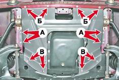 2. Торцовым ключом на 8 мм отворачиваем четыре самореза A бокового крепления, четыре самореза Б переднего крепления и четыре болта B заднего крепления грязезащитного щитка.