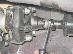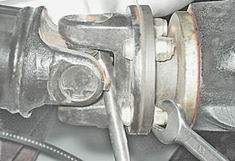 5. Краской или кернером помечаем положение фланцевой вилки карданного шарнира относительно фланца ведущей шестерни главной передачи. 6. Рожковым ключом на 13 мм отворачиваем четыре самоконтрящиеся гайки, удерживая карданный вал от проворачивания большой отверткой или другим подходящим инструментом. B случае коррозии резьбы болтов следует "размочить" соединение проникающей смазкой и воспользоваться специальным рожковым ключом на 13 мм с широкими губками из комплекта для регулировки зазоров в приводе клапанов. Если болты станут проворачиваться, прижимаем их головки к фланцу вилки отверткой.