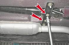 11. Торцовым ключом на 13 мм с удлинителем отворачиваем два болта крепления промежуточной опоры к поперечине.