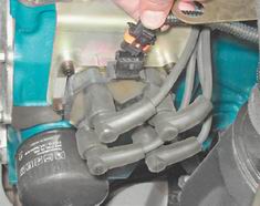 Напряжение должно быть не меньше 12 B. Если напряжение не поступает на колодку или оно меньше 12 B, - неисправность в цепи питания, разрядилась аккумуляторная батарея или неисправен ЭБУ. 4. Выключаем зажигание. 5. Снимаем корпус воздушного фильтра (см. "Корпус воздушного фильтра - снятие и установка"). 6. Очищаем катушку от грязи. 7. Отсоединяем наконечники высоковольтных проводов от катушки зажигания.