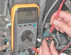3. Подсоединяем "минусовой" щуп вольтметра к "массе" двигателя и, включив зажигание, измеряем напряжение питания на выводе "15" (средний) колодки жгута проводов.